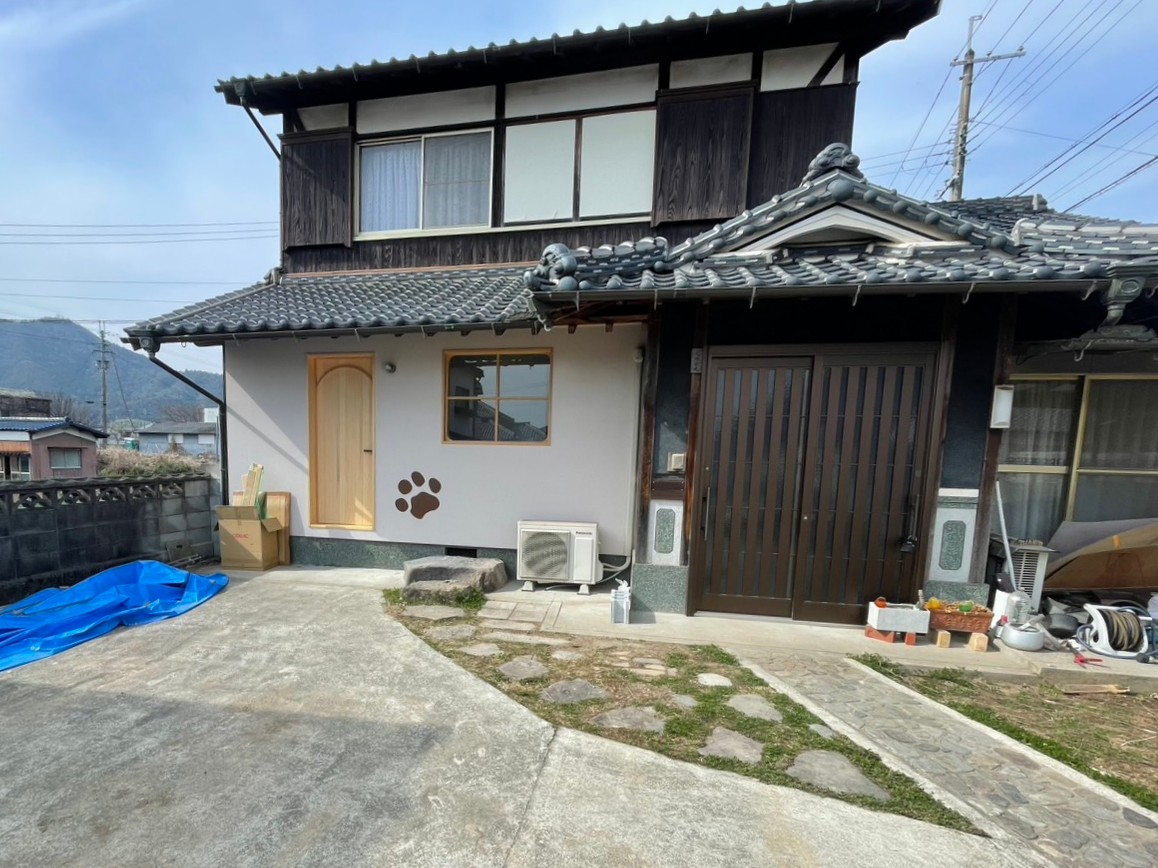 神崎郡市川町の古民家をペットハウスにした工事しました。 床は長尺塩ビシート仕上がりで壁は下から1メートル位はメラミン化粧板を貼ってワンちゃんが嚙めないようにしてます。 そして外観はペットホテルらしいデザインになりました。 更にお客様の知り合いが古民家らしい広々とした空間にドッグランを造る予定です。 まだまだ良くなりそうですね!